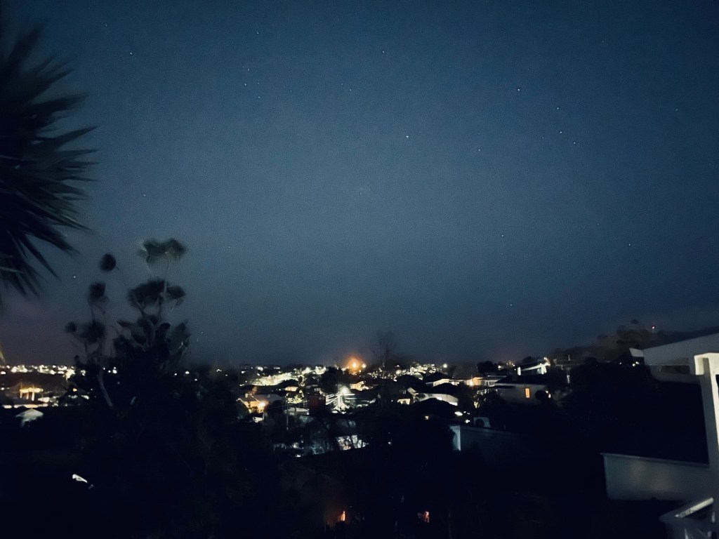 I stand outside my rented flat looking up at the stars shining in the clear sky as they float over Devonport. The Southern Cross hangs in the cool crisp air, and the streets are quiet. I’ve been writing all day. After walking 10 miles, I listen to jazz, sip wine and work on my book. I’ve gotten a lot done. I’m able to collect my thoughts and settle into the stillness that surrounds me. My youngest daughter sleeps on the pull-out sofa in the living room. A man walks past briskly, taking his Australian shepherd for its nighttime walk under the street lights. Dim light glows in the windows of the homes that surround us, and everything is still. The sound of music, conversations, and footsteps in the house above us fill the night air.