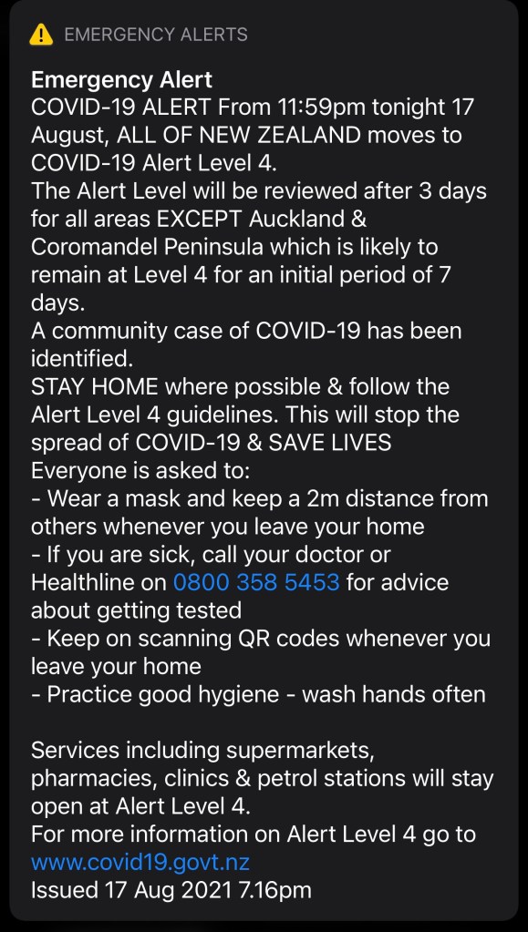 We’ve lasted pretty well so far. The one-bedroom apartment is cramped, of course, but the 4 of us are putting systems in place that work. We’ve been in our family bubble in lockdown since August 18th. And on Tuesday, August 31st, the NZ government will reevaluate the country’s isolation situation.